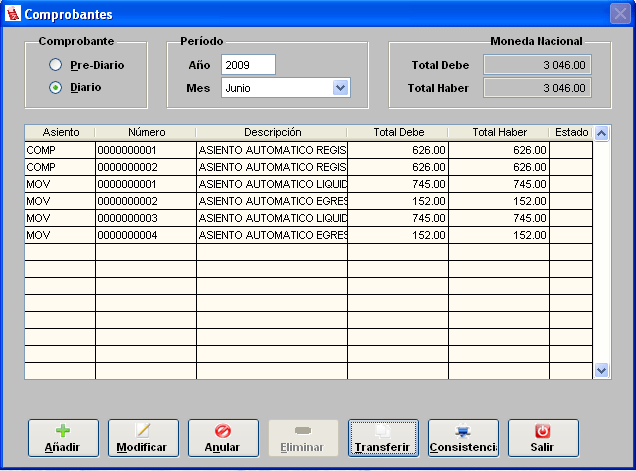 COMPROBANTE. Registro de Comprobante Contable, Transferencia de Pre-Diario a Diario, Consistencia de Comprobantes, etc.